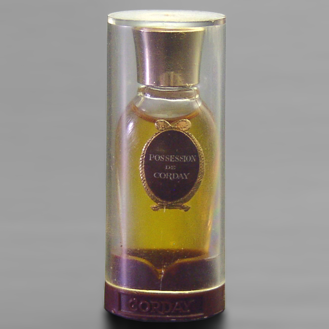 SEMI-VINTAGE – 1/10 fl.oz perfume, gold screw-on lid, brown paper label with white print, 44 mm tall, with box