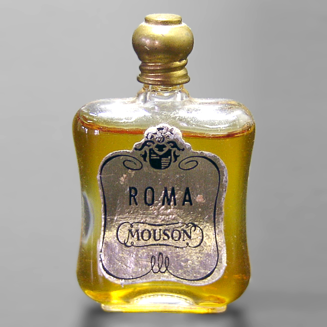 1/5 fl.oz perfume, golden „ball-shaped flattened“ metal screw-on lid, clear glass, golden paper label with black print, lower edge „bow„, 53 mm tall