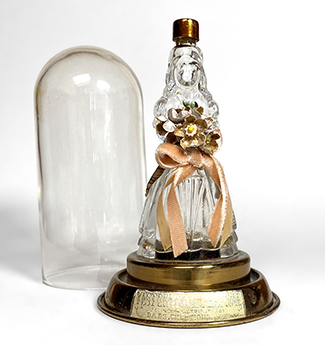 VINTAGE – 1 fl.oz perfume (no contents), bronze-colored metal screw-on lid, clear glass bottle in the shape of a woman, with a light brown/apricot-colored bouquet of flowers tied with a bow around her waist, bottle is approx. 106 mm tall, total height of the presentation 137 mm; the base is made of gold-colored metal (a bit tarnished), the bottle is firmly attached to the base, the perfume presentation is in very good condition for its age, around 1940s, USA